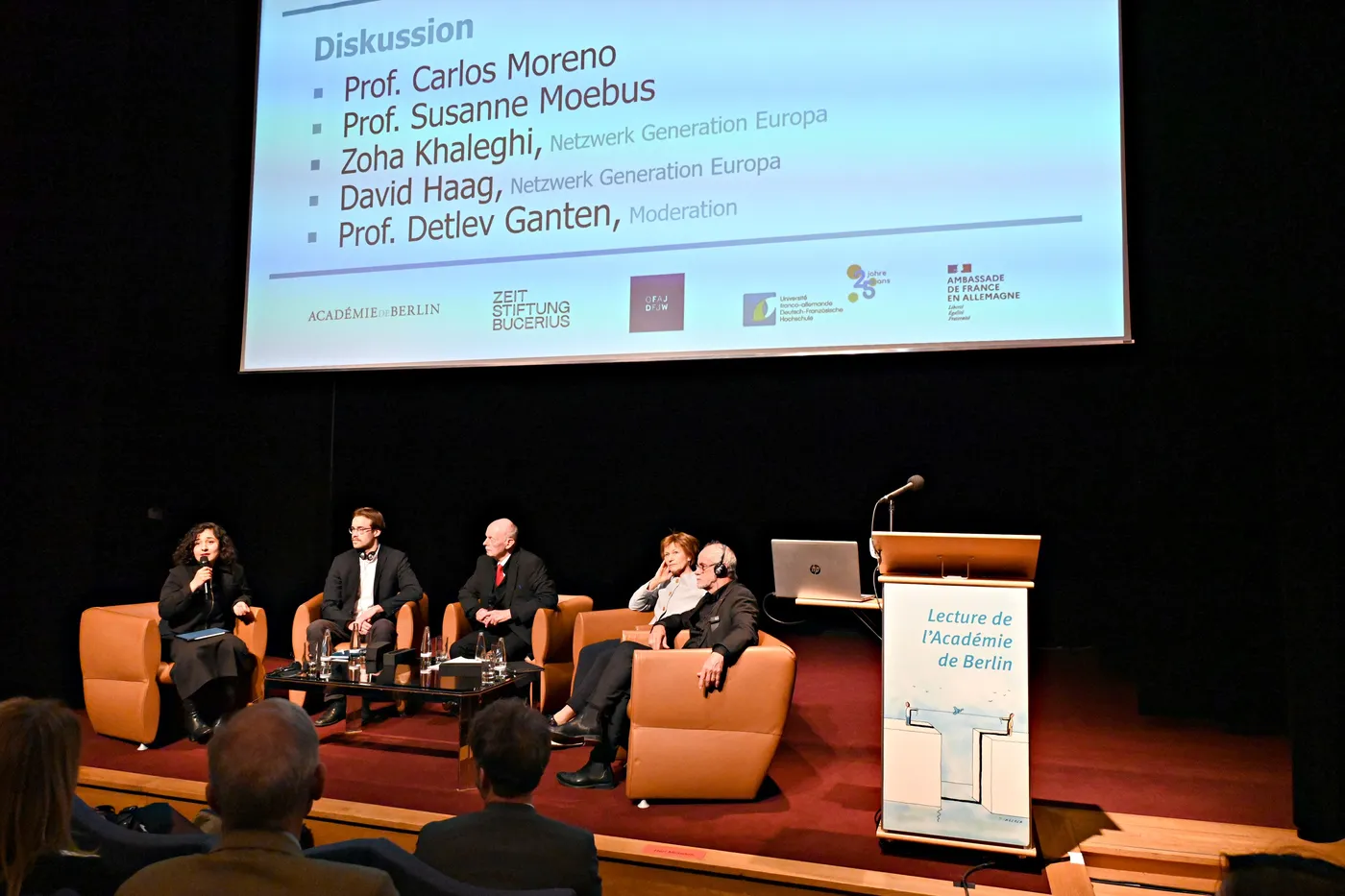 Es folgte eine Diskussion der Referenten mit Zoha Khaleghi und David Haag aus dem Netzwerk „Generation Europa“ sowie mit dem Publikum, moderiert von Prof. Detlev Ganten, Virchow Foundation.
